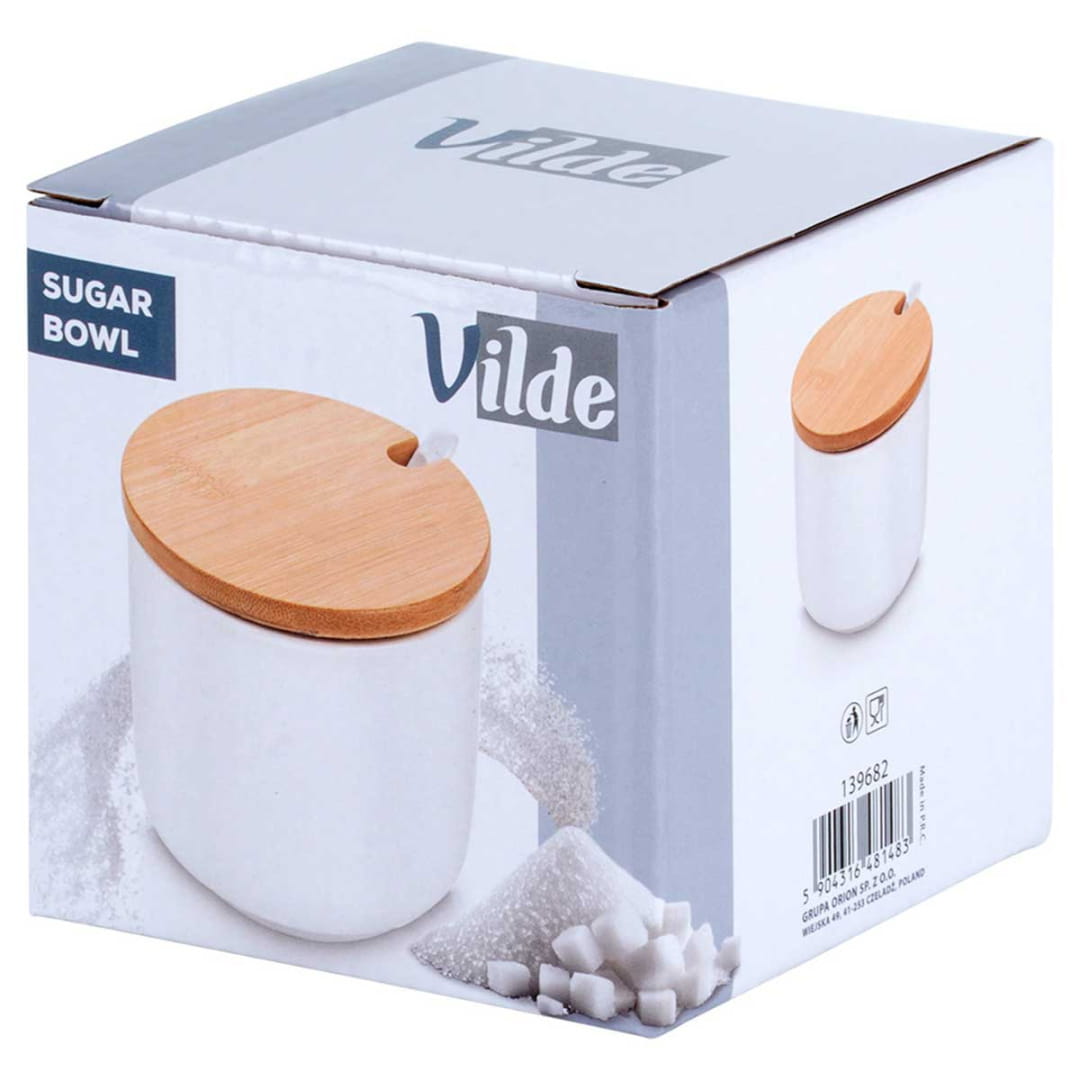 Efektowna cukiernica z uchylną pokrywą oraz łyżeczką w zestawie. Cukiernica jest utrzymana w klasycznym stylu, więc idealnie komponuje się z pozostałą zastawą. Dzięki eleganckiemu designowi cukiernica jest nie tylko praktyczna, ale również stanowi piękną ozdobę każdego stołu. Oryginalny produkt marki Vilde. Wyprodukowano zgodnie z europejskimi standardami.