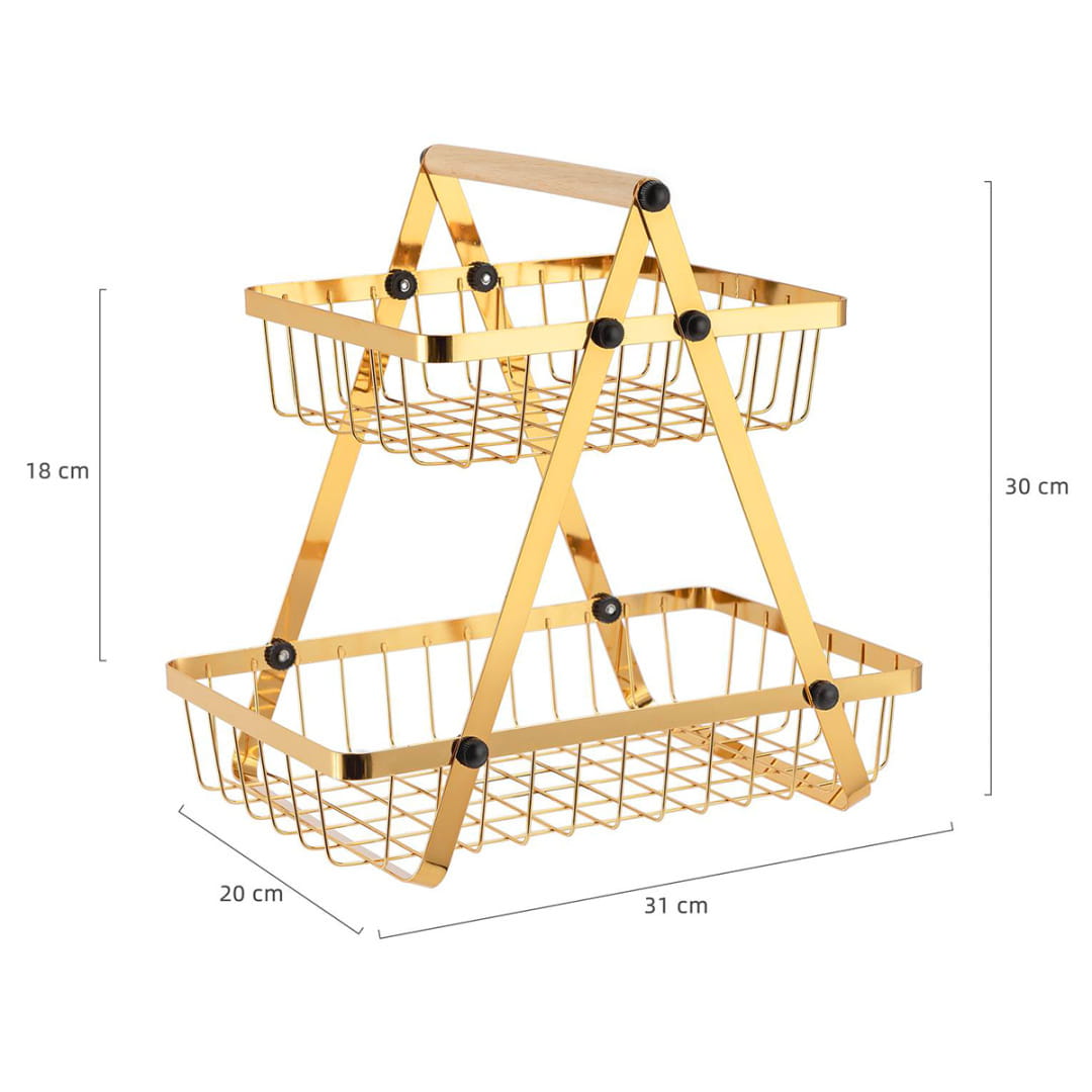 Koszyk piętrowy na owoce wykonany z prętów stalowych w kolorze złotym. Może posłużyć do przechowywania owoców, warzyw lub przekąsek. Koszyk fantastycznie prezentuje się zarówno na kuchennym blacie jak i na eleganckim stole. Idealnie komponuje się z wnętrzami urządzonymi w stylu glamour. Drewniana rączka do przenoszenia.