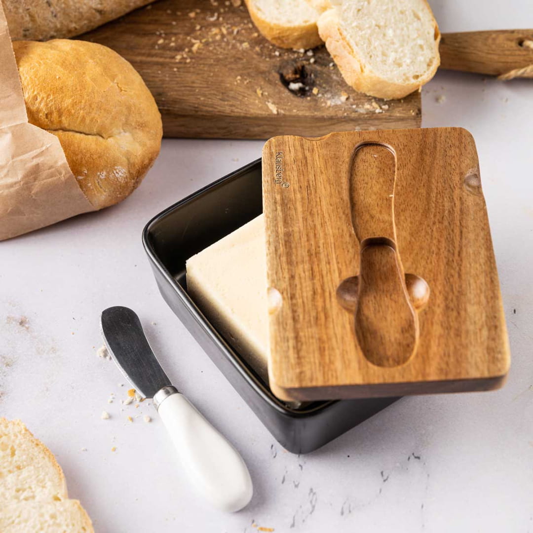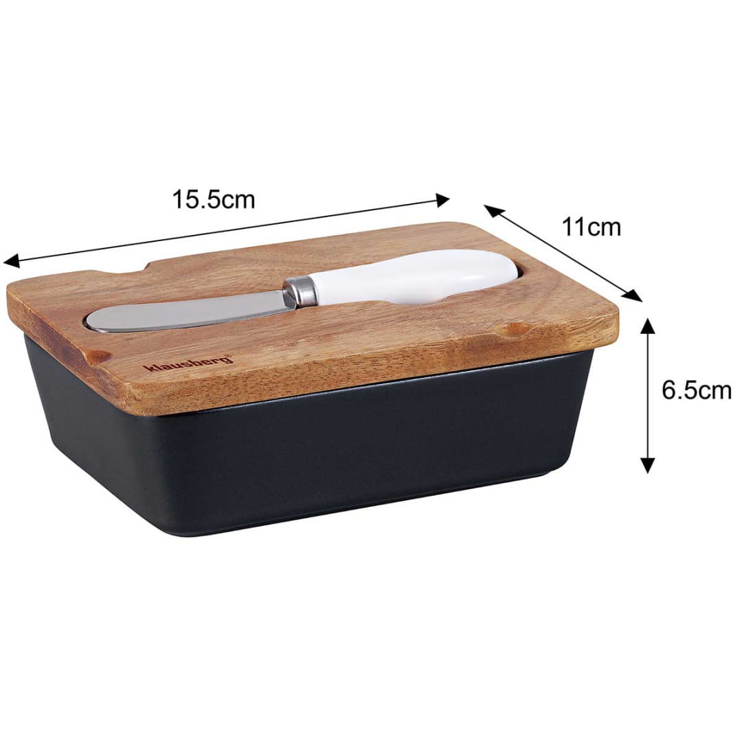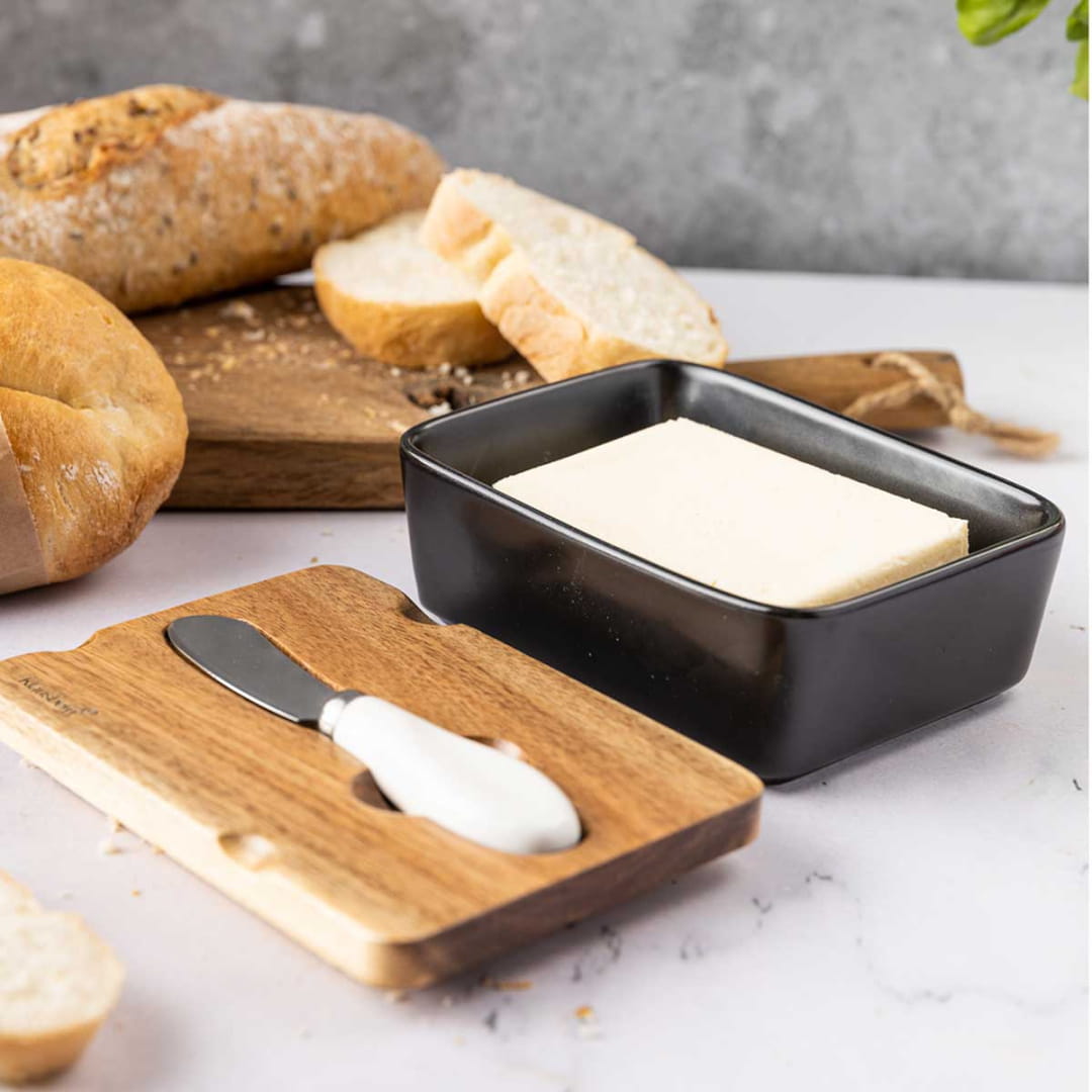 Maselniczka w nowoczesnym stylu, wykonana z wysokiej jakości porcelany w głębokim czarnym kolorze. Pokrywa maselniczki została wykonana z drewna akacjowego, które charakteryzuje się naturalnym wykończeniem i ciepłym odcieniem, wprowadzając elegancki kontrast do minimalistycznego designu porcelany. Zestaw uzupełnia konturowany nożyk do smarowania, z ergonomiczną porcelanową rękojeścią, która idealnie pasuje do maselniczki, podkreślając jej spójny styl. Idealny wybór do serwowania masła na stole, łączący funkcjonalność z estetyką.