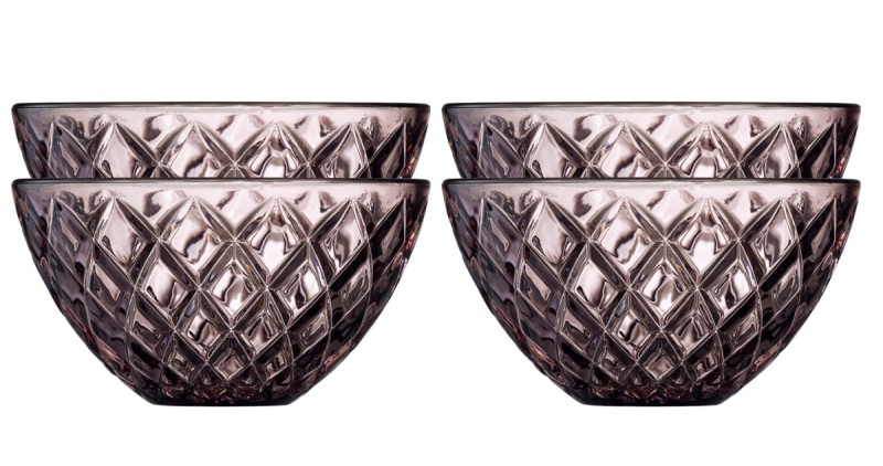 4 miski o średnicy 12 cm, wykonane z kolorowego szkła. Klasyczny design z eleganckimi fasetami, które odbijają światło i intensyfikują wrażenia wizualne, niezależnie od tego, czy serwujesz przekąski, pyszne dipy, czy pojedyncze porcje deseru. Doskonale sprawdzą się również jako pucharki na lody, miseczki na sałatki owocowe lub galaretki.