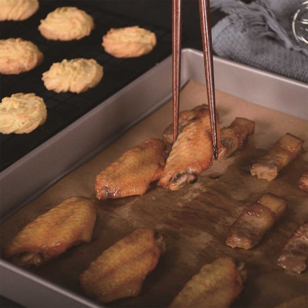 Dzięki odporności na temperatury od -40C do +230C (do 428F), papier sprawdzi się zarówno podczas pieczenia, smażenia, jak i gotowania na parze. Zawsze używaj go razem z jedzeniem – zapobiega przywieraniu potraw, ułatwia utrzymanie urządzeń w czystości i skraca czas sprzątania.