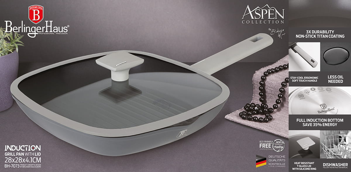 Naczynia z serii ASPEN firmy BERLINGER HAUS wykonane są z wysokiej klasy odlewanego aluminium pokrytego wewnątrz powłoką tytanową o bardzo wysokim współczynniku twardości. Powłoka zewnętrzna w kolorze szarym. Te atrakcyjne i modne naczynia wyposażone są standardowo w uchwyty typu SOFT TOUCH (silikon handle)oraz pokrywki z silikonowymi uszczelkami.Przystosowane do wszystkich rodzajów kuchenek: gazowa, elektryczna, ceramiczna, halogenowa, indukcyjna. System TURBO INDUCTION (bardzo szybko nagrzewają się) pozwala zaoszczędzić nawet 35% energii.