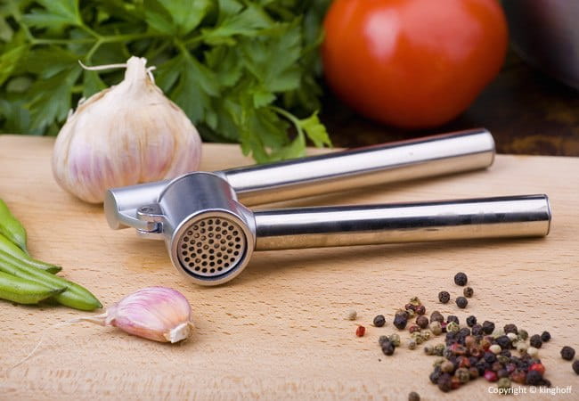 Wyciskacz do czosnku firmy Kinghoff został wyprodukowany z wysokiej jakości stali nierdzewnej.