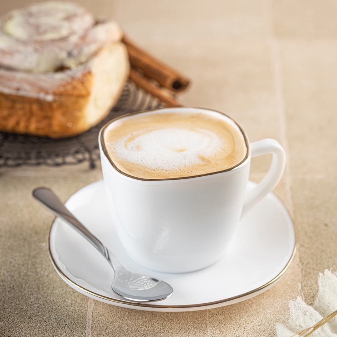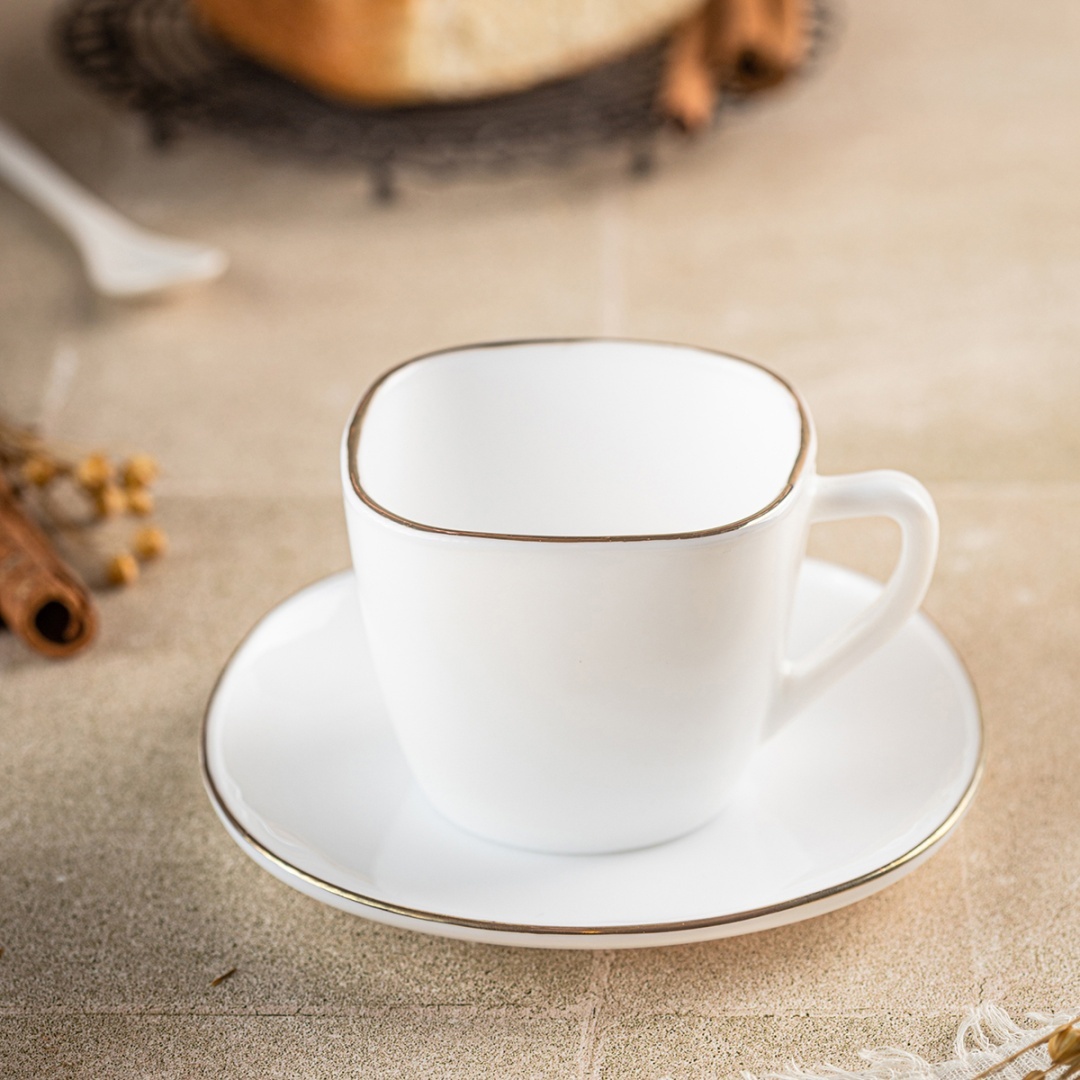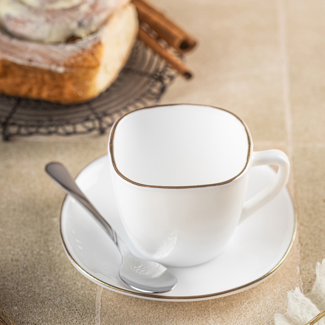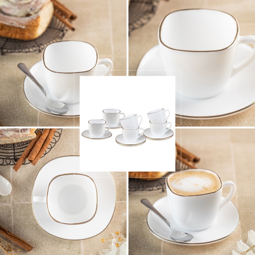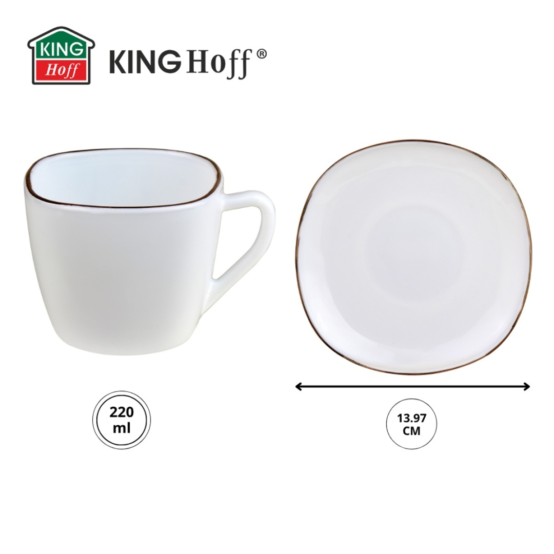 Zestaw filiżanek KINGHoff to propozycja dla osób, które cenią niebanalny design i funkcjonalność. Kwadratowy kształt z zaokrąglonymi krawędziami, biały kolor i delikatne złote zdobienie sprawiają, że komplet prezentuje się niezwykle stylowo – zarówno podczas codziennego śniadania, jak i przy kawie z gośćmi.