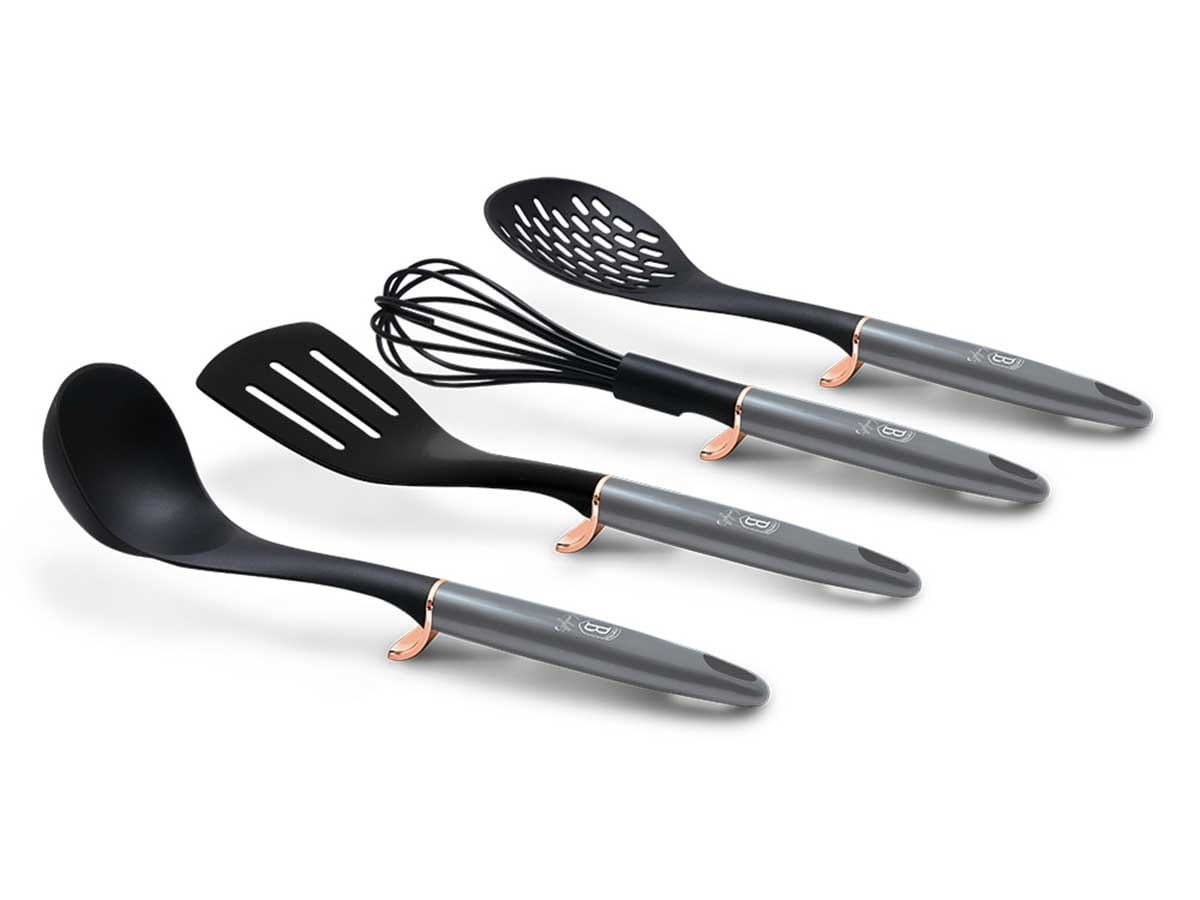 4 elementowy zestaw nylonowych przyborów kuchennych firmy BERLINGER HAUS z linii MOONLIGHT. Przybory polecane szczególnie do naczyń z powłokami ceramicznymi i teflonowymi. Materiał z którego są wykonane nie rysuje powierzchni naczyń. Jest odporny na wysoką temperaturę do 210 stopni C. Posiada szczególne właściwości antybakteryjne.