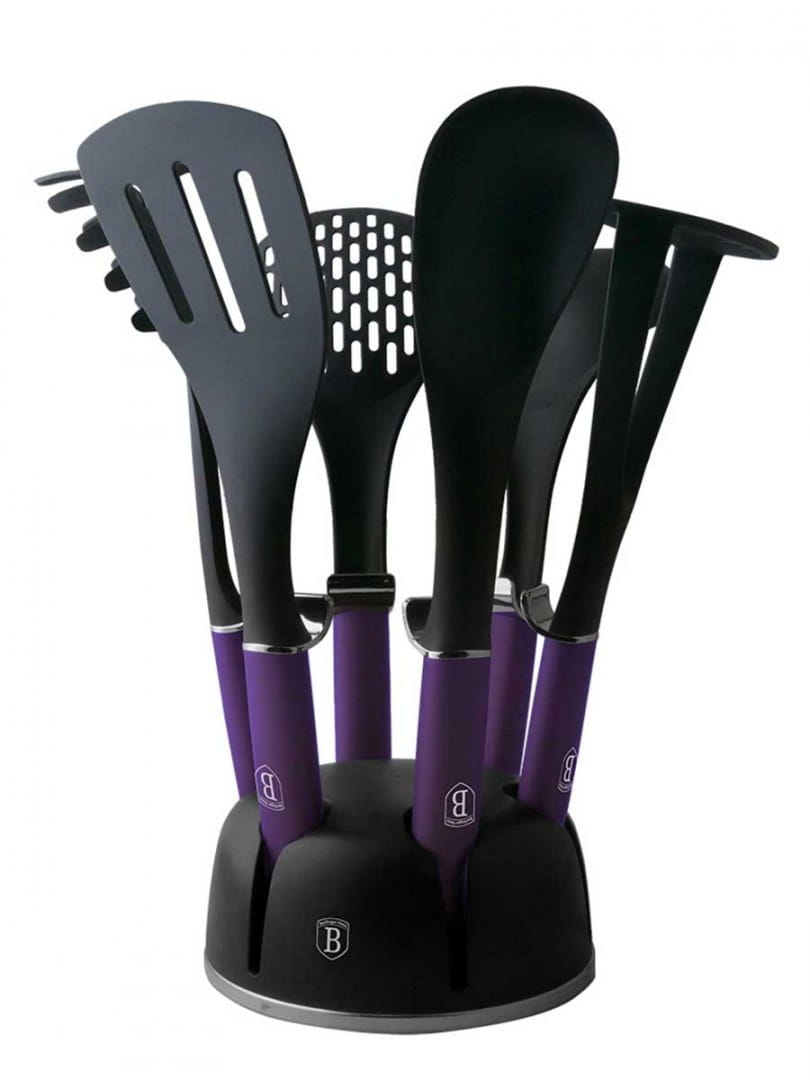 7 elementowy zestaw nylonowych przyborów kuchennych firmy BERLINGER HAUS z linii PURPLE ECLIPSE COLLECTION. Przybory polecane szczególnie do naczyń z powłokami ceramicznymi i teflonowymi. Materiał z którego są wykonane nie rysuje powierzchni naczyń. Jest odporny na wysoką temperaturę do 210 stopni C. Posiada szczególne właściwości antybakteryjne.