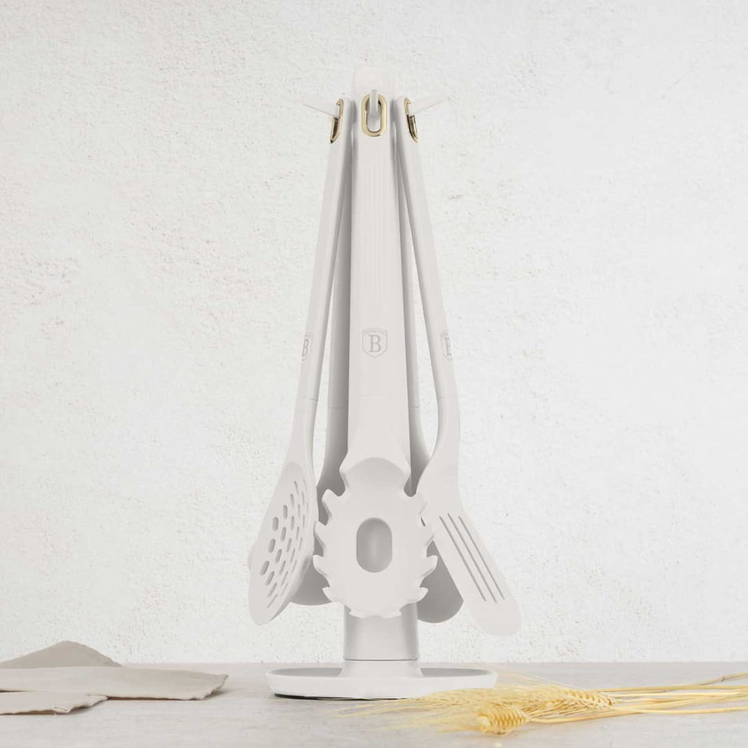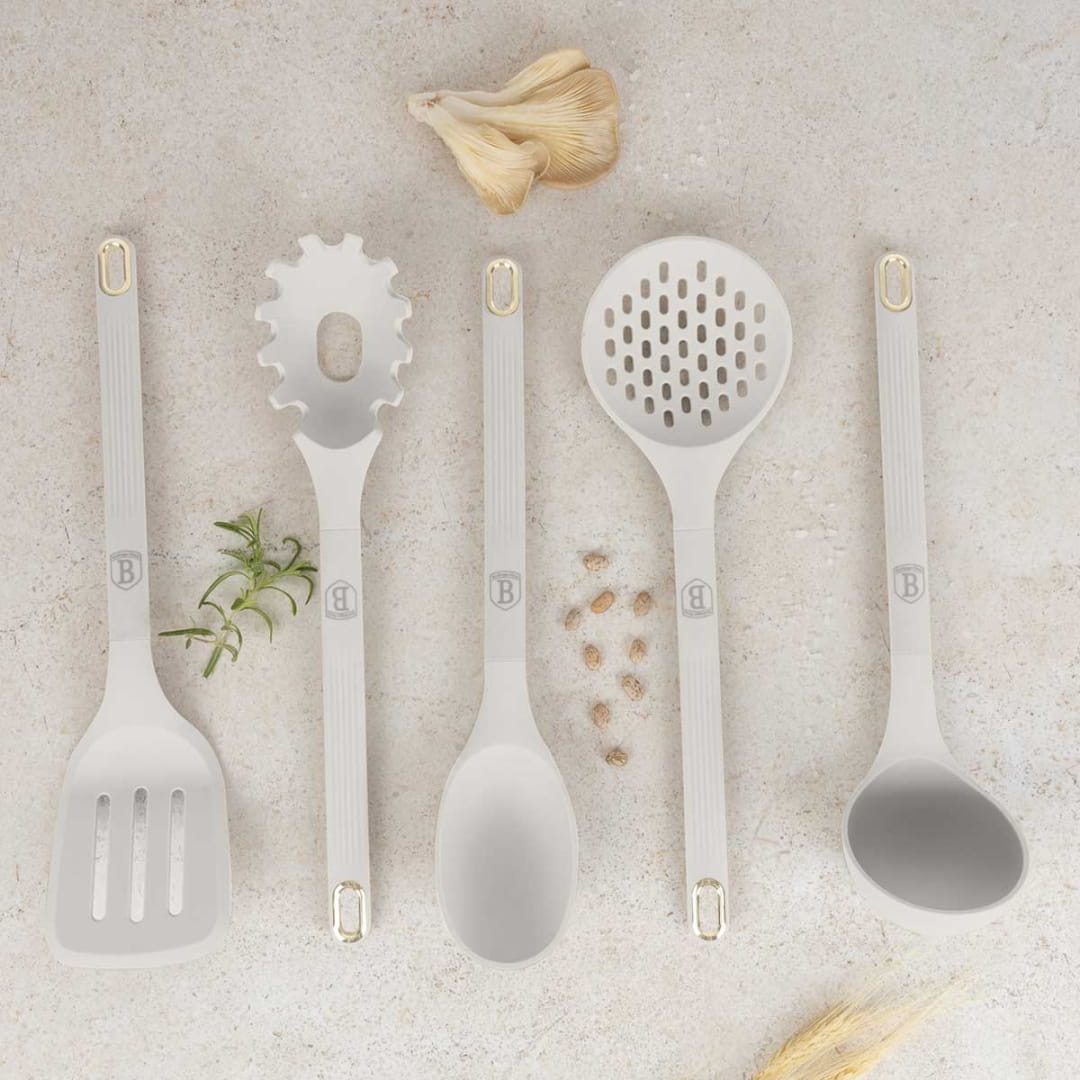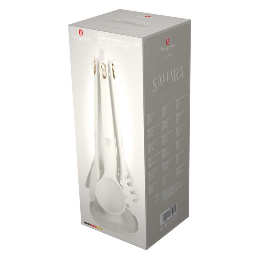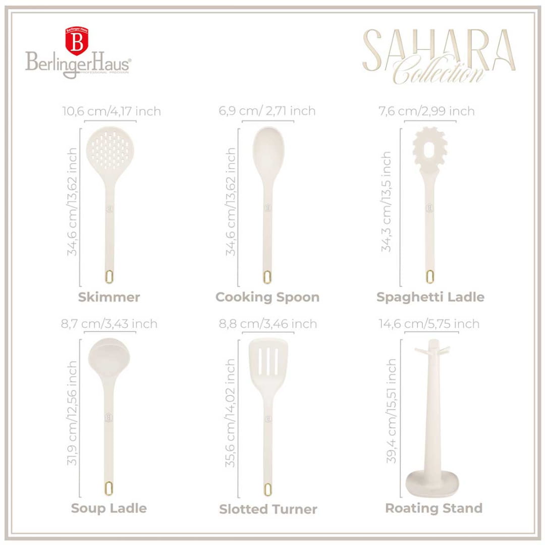 6 elementowy zestaw nylonowych przyborów kuchennych firmy BERLINGER HAUS z linii Sahara Collection. Przybory polecane szczególnie do naczyń z powłokami ceramicznymi i teflonowymi. Materiał z którego są wykonane nie rysuje powierzchni naczyń. Jest odporny na wysoką temperaturę do 210 stopni C. Posiada szczególne właściwości antybakteryjne.
