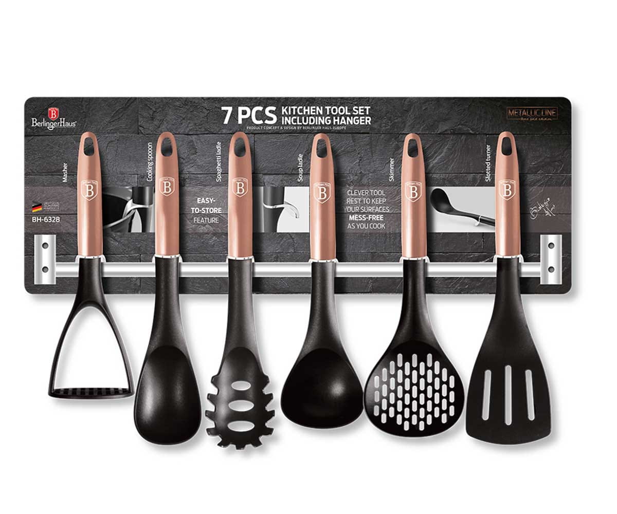 7 elementowy zestaw nylonowych przyborów kuchennych firmy BERLINGER HAUS z linii Rose Gold Collection z praktycznym wieszakiem ściennym. Przybory polecane szczególnie do naczyń z powłokami ceramicznymi i teflonowymi. Materiał z którego są wykonane nie rysuje powierzchni naczyń. Jest odporny na wysoką temperaturę do 210 stopni C. Posiada szczególne właściwości antybakteryjne.