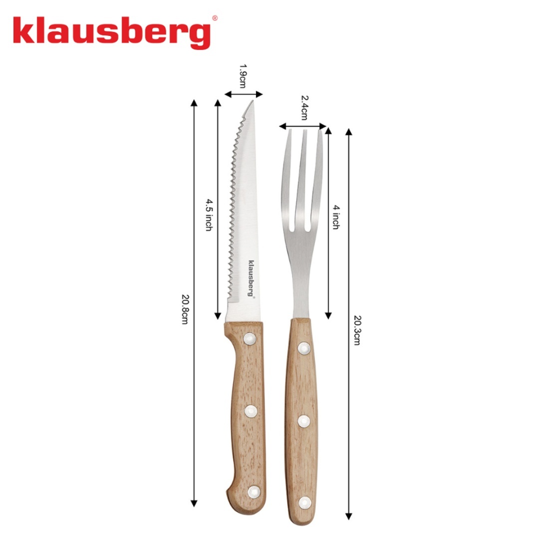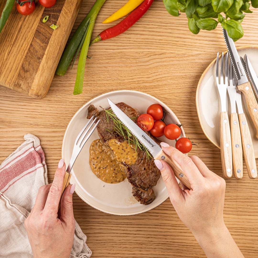 Elegancki i solidny zestaw do steków i grillowania KLAUSBERG to idealny wybór dla miłośników mięs, BBQ i dobrego jedzenia w stylu rustykalnym. W komplecie znajduje się 8 elementów – 4 ostre, ząbkowane noże oraz 4 widelce wykonane z wysokiej jakości stali nierdzewnej. Drewniane, nitowane uchwyty zapewniają naturalny, pewny chwyt i nadają zestawowi elegancki, klasyczny wygląd.